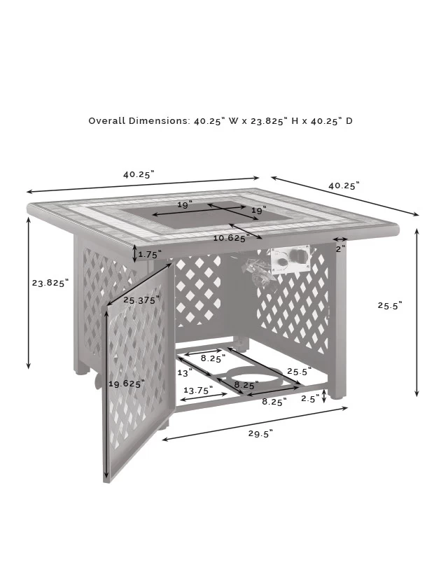 Gather around the Tucson Fire Table for a toasty evening under the stars. Constructed from a sturdy weather-resistant steel frame and a beautifully tiled stone top, this substantial firepit is ready to become the centerpiece for any outdoor seating. The gas controls and a rack for a propane tank are located inside the table’s lattice-style base, keeping them close at hand but out of sight. Stay warm and cozy in the great outdoors with this long-lasting fire pit table.