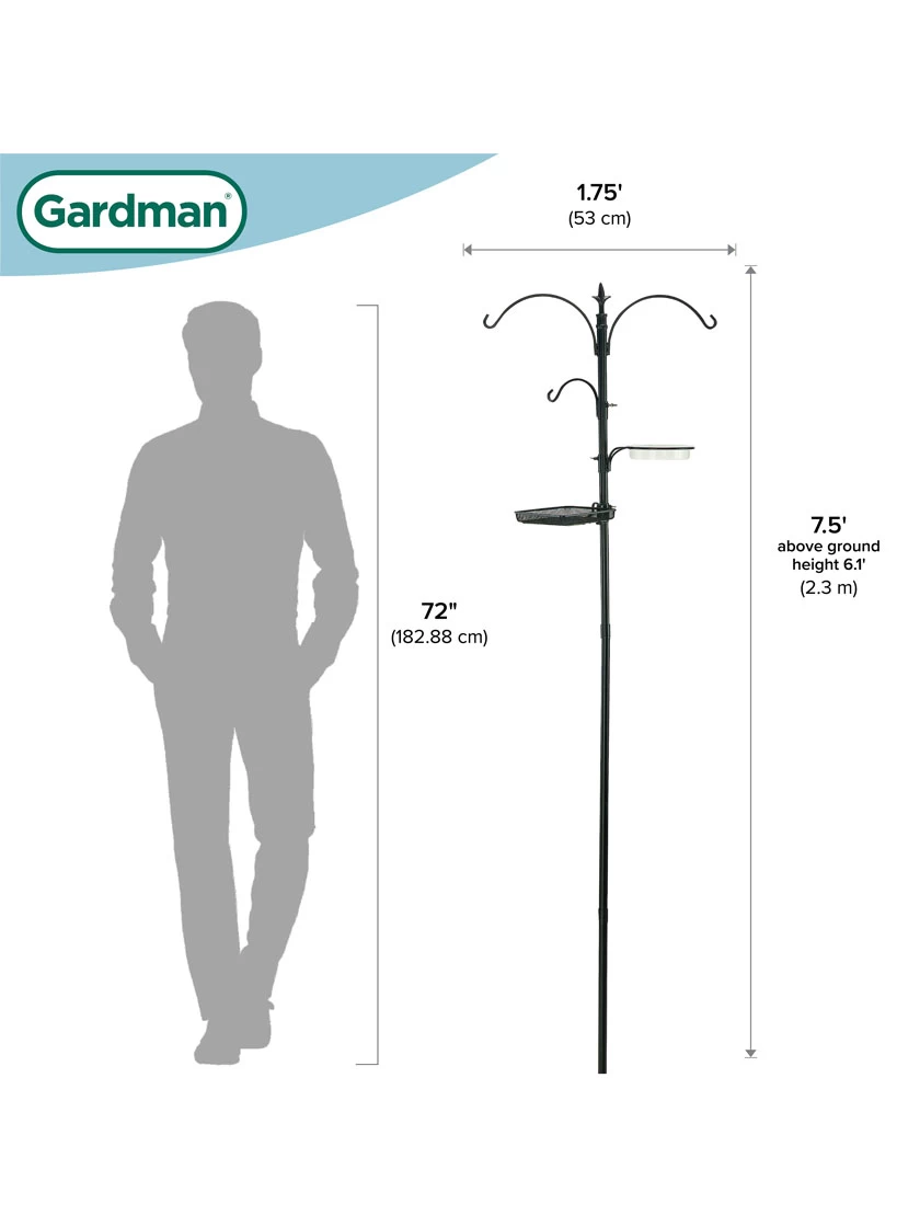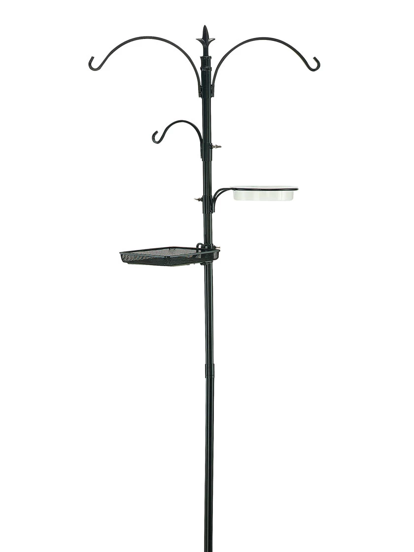 Everything required for a backyard bird feeding station at a great value. Provides four levels of bird watching on one heavy-duty metal pole. Decorative fleur-de-lys finial top. Provides: twin hooks to accommodate two hanging feeders, one small feeder hook, bird bath supporting ring with bird bath, and micro-mesh seed tray. above ground height of 73″ (total height 90″). All metal surfaces feature a tough rust resistant black powder coat finish. Some easy assembly is required.