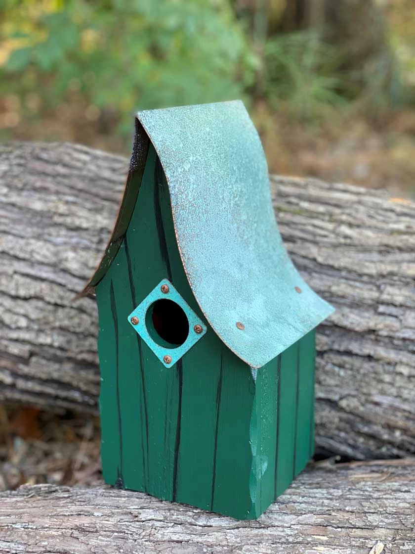 Your songbirds will have it “made in the shade” with this happy haven. Beautifully designed with cypress sides and copper verdigris roof, Shady Shed is also carefully constructed, hand painted and distressed for an elegantly aged look. Add in a copper leaf/predator guard, and all together it’s the kind of care your songbirds deserve and need. 1.5″ entrance hole, square copper cover over a round clean out hole.