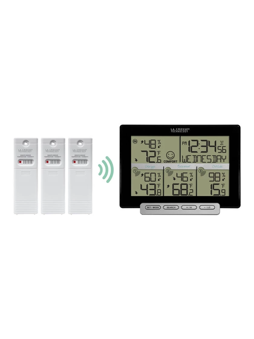 Multi-functional station shows you temperature and humidity indoors and out, as well as up to 3 additional rooms. Displays a smiley face for comfortable room climate, within +66.2F to 77F and 40 to 60%RH range. Displays frowny face, if at uncomfortable levels inside your home. Writable display, pencil only, to identify each room you’re monitoring from a storage room, basement, garage or other source. From the garage to the attic, let the wireless technology leave you in comfort knowing room conditions elsewhere. Battery operated, not included, with a 300 foot unobstructed wireless range from wireless transmitting sensors.